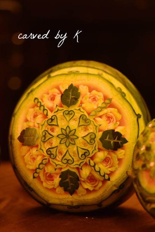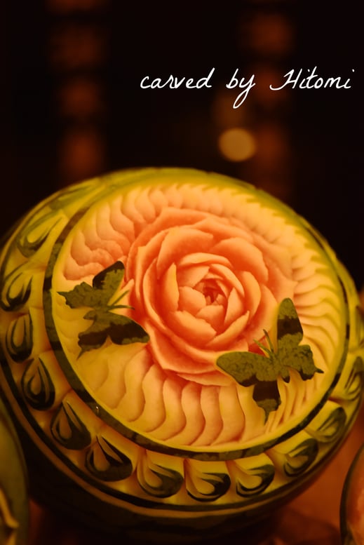 人とのご縁を大切に、そして食べる事をこよなく愛されている稲田さん主催の「食の稲田会」はいつも多くの方が来られ、飲んで食べて喋って笑って・・・毎回とにかく楽しい会なのですが、今回稲田さんからお声掛け頂き、パーティー会場でスイカのカービングを展示させて頂けることになりました。