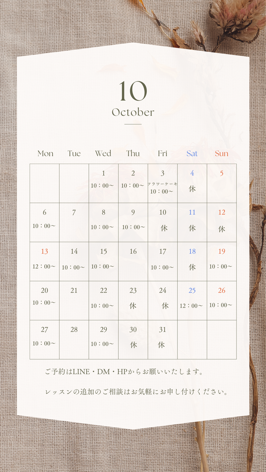 各レッスン、資材手配のためお申し込み期限が異なります。詳しくはレッスンポリシーにてご確認ください。